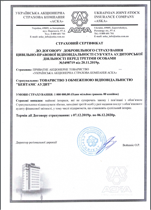 07 декабря 2019 года заключен договор страхования с частным акционерным обществом "Украинская акционерная страховая компания «Аска», который гарантирует возмещение ущерба, нанесённого третьим лицам (в т. ч. юридическим) вследствие профессиональной деятельности.